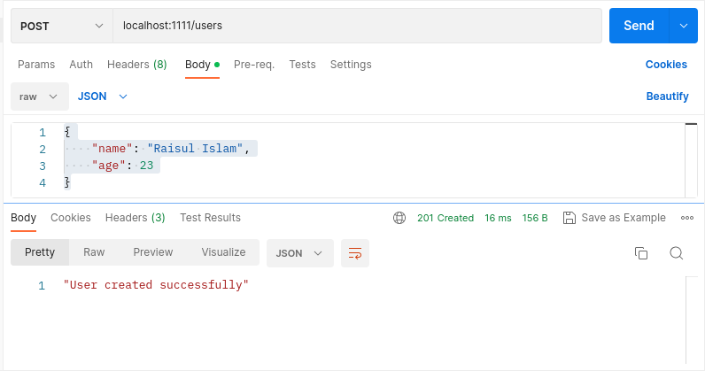 “localhost:1111/users” route এ নিচের json ভ্যালুটি ব্যবহার করে POST রিকোয়েস্ট দেয়ার মাধ্যমে, আমরা Create ফাংশনালিটি ঠিকঠাক শেষ করতে পেরেছি কিনা তা চেক করতে পারি –