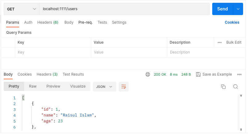 “localhost:1111/users” route এ GET রিকোয়েস্ট পাঠিয়ে আমরা Read ফাংশনালিটি ঠিকঠাক শেষ করতে পেরেছি কিনা তা চেক করতে পারি।