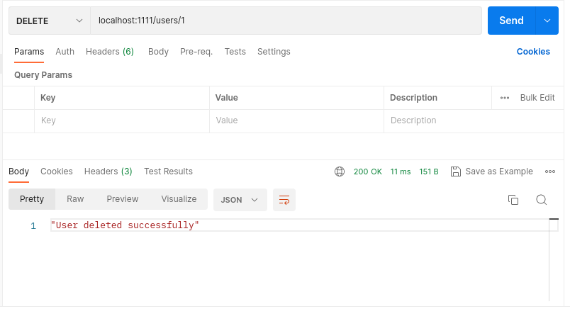 “localhost:1111/users/1” route এ DELETE রিকোয়েস্ট পাঠিয়ে আমরা DELETE ফাংশনালিটি ঠিকঠাক শেষ করতে পেরেছি কিনা তা চেক করতে পারি –