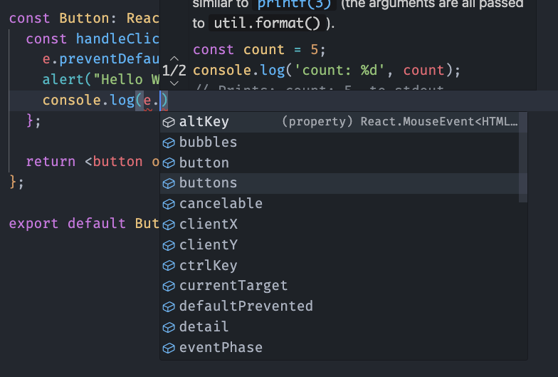 উপরের উদাহরণে আমরা একটি button এলিমেন্টের ইভেন্ট হ্যান্ডেল করেছি। এইখানে যেহেতু ক্লিক ইভেন্ট accept করছি তাই handleClick ফাংশনের প্যারামিটারে e-এর টাইপ সেট করেছি MouseEvent। লক্ষণীয় হল MouseEvent টাইপটি রিয়েক্ট থেকে ইমপোর্ট করেছি। কারন আগেই বলেছি রিয়েক্ট তার DOM Element-এর টাইপ নিজেই প্রোভাইড করে।